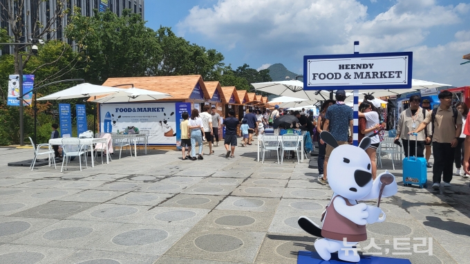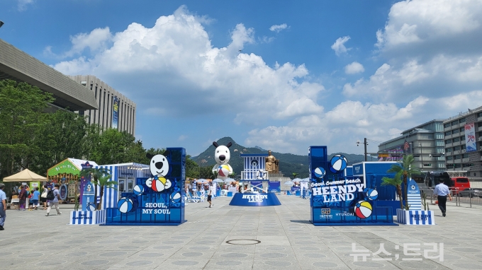 흰디 조형물 주변에는 파랗고 하얀 흰디랜드가 조성돼 있어 경쾌하고 시원한 여름 분위기를 자아냈다. 물총놀이 시설과 더불어 쉼터 카라반과 선베드, 파라솔이 비치돼 있었다. 비치타올을 구매할 수 있는 자판기도 놓여있어서 흡사 휴양지에 놀러온 듯했다. 서울 한복판이라고 믿기지 않을 정도였다.