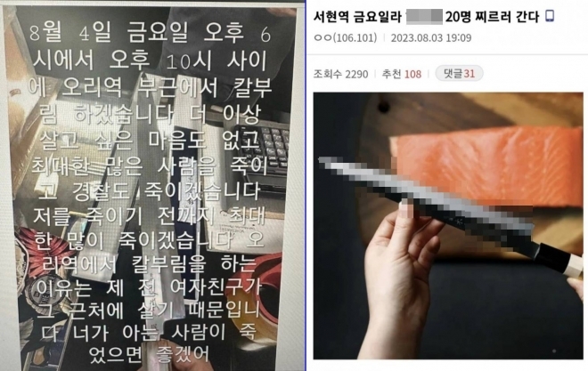 신림역에 이어 서현역에서도 흉기난동으로 다수의 사상자가 발생한 이후 묻지마 칼부림을 예고하는 글들이 온라인에 연달아 올라오면서 시민들이 불안에 떨고 있다.