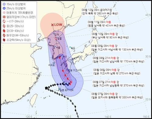 7일 기상청에 따르면 이날 오전 9시 일본 오키나와 동북동쪽 330㎞ 해상을 지난 '카눈'은 일본 가고시마 서쪽 해상에서 북진해 10일 오전 9시 부산 남서쪽 90㎞ 해상에 도달한다. 경남남해안에 상륙한 '카눈'은 강한 세력을 유지한 채 한반도를 지날 것으로 예상돼 우려하던 일이 현실이 되고 있다.