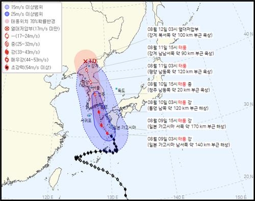 10일까지 강원 영동과 경상권 해안, 경상 서부 내륙, 전라 동부 내륙, 전남 남해안, 제주도에는 시간당 40∼60㎜, 그밖의 지역은 시간당 30㎜ 안팎의 매우 강한 비가 오는 곳이 있겠다. 강원 영동은 시간당 60∼80㎜, 곳에 따라 100㎜ 이상 비가 쏟아질 전망이다.