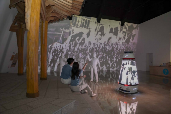 독립기념관 체험관에서는 AI 미디어로봇이 관람객과 실시간 대화와 영상을 통해 독립운동의 역사를 쉽고 재미있게 설명하고, 체험 프로그램도 안내한다.