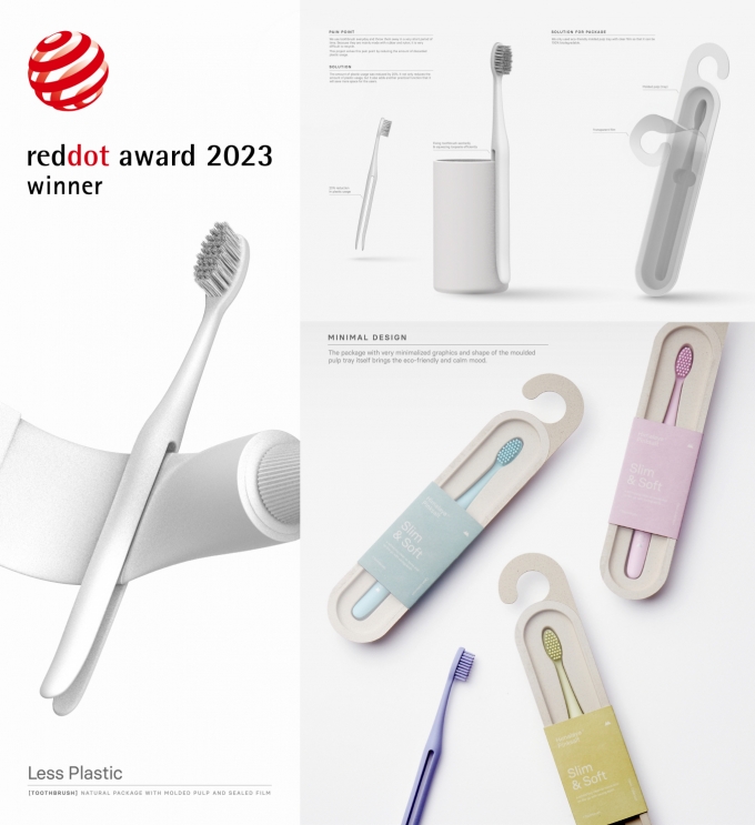 칫솔 손잡이의 빈 홈은 다양한 양치 컵에 칫솔을 거치할 수 있는 홀더로 활용하거나 '치약 짜개'로 쓸 수도 있다. 또 미니멀하고 부드러운 파스텔 색상을 칫솔에 적용해 자연과 어울리는 디자인을 구현했다. 제품 패키지는 친환경 펄프 몰드와 투명 필름을 활용해 100% 분리배출이 가능하다. 부드러운 곡선과 심플한 모양의 펄프 몰드에는 자연친화적이고 차분한 감성을 담았다.