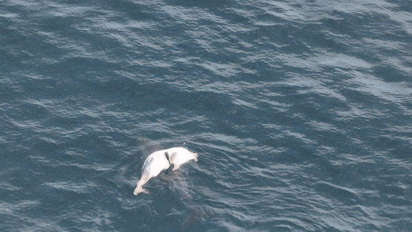 신고를 받고 출동한 해경은 폐그물을 절단하기 위해 입수해 돌고래에 접근했는데, 가까이서 확인해보니 돌고래 등에 걸려있던 것은 폐그물이 아닌 새끼 돌고래의 사체였다. 구조대원이 접근하자 돌고래는 죽은 새끼를 뺏기지 않으려고 업고 있던 사체를 이리저리 옮기며 이동했다.