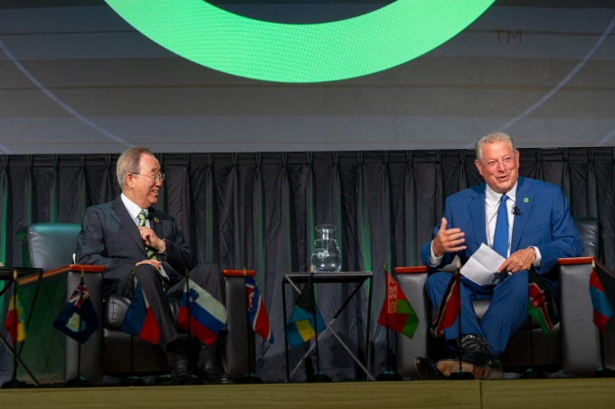 이날 고어 전 부통령과 나란히 단상에 배석한 반기문 전 유엔사무총장은 "기후위기 대응에 있어 정책 지도자, 경제 지도자, 시민사회 이 3가지의 파트너쉽이 절대적으로 필요한데 시민들의 인식이 높아지고, 경제계는 수출을 위해 부단히 노력하는 반면 정치권만 기후 밖에서 싸우고 있는 것 같다"고 밝혔다.