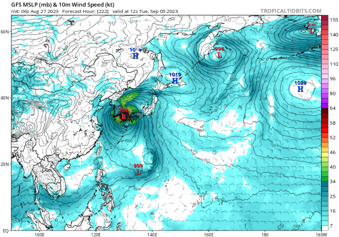 실제로 지난 27일 15시 기준 GFS 중장기예보 모델에 따르면 이로부터 약 222시간 후인 9월 5일 21시경에 중심기압 952헥토파스칼(hPa)의 엄청난 기압값으로 한반도 영남지방에 상륙할 가능성이 있는 것으로 예보하고 있다.