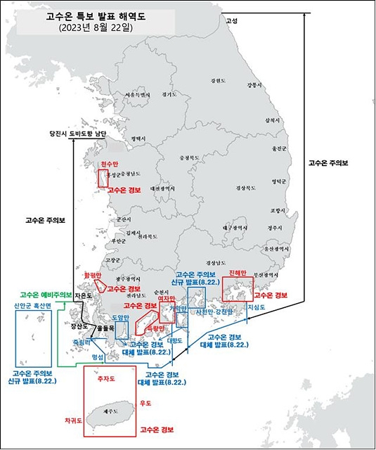 지난해 같은 시기 23.1℃였던 수온은 현재 28℃를 넘기고 있다. 해양수산부 국립수산과학원은 바닷물 온도 3일 연속 28℃ 이상 지속되자, 지난 25일자 오후 2시부로 남해중부 연안과 경남 사천·강진만에 '고수온 경보'를 내렸다. 앞서 이달중순 제주에서도 고수온 경보가 내려진 적이 있고, 인천지역을 제외한 대부분의 연안 바다들이 고수온에 시달리고 있다.