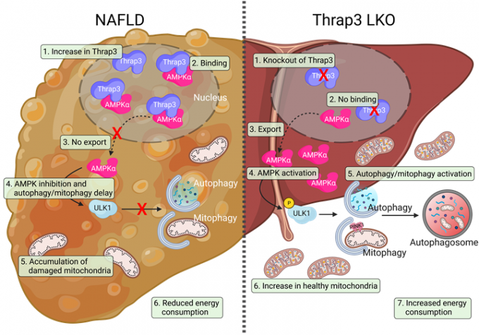 연구팀은 동물실험을 통해 간에서 드랩3 단백질이 AMPK와 직접 결합하는 것을 확인했다. 이는 세포핵 안의 AMPK가 세포질로 이동하는 것을 방해한다. 중성지방을 분해하고 콜레스테롤 수치를 낮추는 자가소화작용(Autophagy)의 효과 또한 저해한다. 즉 드랩3의 발현을 억제시키면 비알코올성 지방간을 효과적으로 치료할 수 있다는 것이다.
