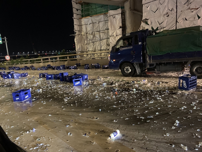 새벽에 맥주상자를 싣고 가던 화물차에서 맥주 4000병이 쏟아져 도로가 유리파편에 난장판이 됐다.