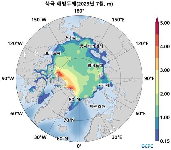 이에 따라 7월 북극 주변 해빙 두께가 1m 이내로 얇아지고 있어 주변의 따뜻한 해수가 유입될 경우 향후 북극에 폴리냐가 더 빈번하게 발생할 수 있다고 KIOST는 우려했다.