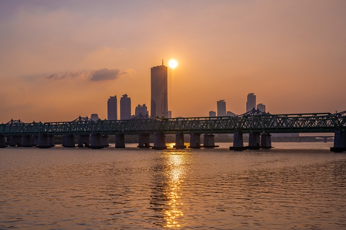 한강 노들섬에서는 한강철교를 오가는 1호선 전철과 여의도의 고층빌딩 그리고 햇볕에 반짝이는 윤슬이 아름다운 한강을 배경으로 노을을 즐길 수 있다.