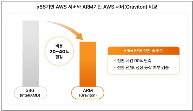 국내 클라우드 서버 시장은 현재 대부분이 인텔이나 AMD CPU 기반으로 구축돼 있다. 아마존이 저전력에 성능까지 뛰어난 ARM기반 자체 개발 CPU인 그래비턴(Graviton) 서버로 지난 2021년 클라우드 서비스를 시작하면서 일부 기업이 전환을 추진했으나, 단순히 서버만 변경할 경우, 프로그램이 작동하지 않거나 성능이 급격이 떨어져 실제 전환으로 이어지는 사례는 미미한 수준이다.