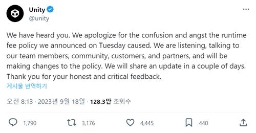 18일 유니티테크놀로지스는 소셜서비스(SNS)를 통해 "지난 12일 발표한 '런타임 가격정책'으로 혼란과 불안을 야기해 죄송하다"며 "커뮤니티와 소비자, 고객사들의 의견을 듣고 정책을 변경할 예정"이라고 공지했다.