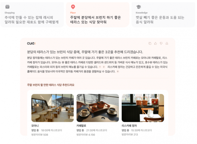 검색 편의성이 높아진 것뿐만 아니라 기존 검색의 한계점도 보완됐다. 키워드 기반 검색은 이용자가 입력한 검색 키워드에 부합하는 문서를 찾아주는 방식이기 때문에 원하는 결과를 얻을 때까지 반복해서 검색해야 한다. 큐:는 다양한 의도가 섞인 문장을 입력해도, 파편화된 네이버 서비스와 검색 결과 속에서 적합한 정보를 찾고, 이를 조합하여 복합적인 답변을 생성한다.