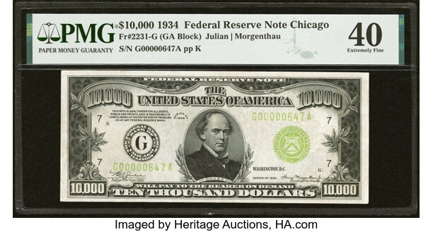 20일(현지시간) 미국 경매회사 '헤리티지옥션'은 1934년 미국 재무부가 발행한 1만달러짜리 지폐가 지난주 캘리포니아주에 위치한 컨벤션센터 롱비치엑스포에서 열린 경매에서 48만달러, 우리돈 약 6억4000만원에 낙찰됐다고 밝혔다. 이는 원가의 50배에 달한다.
