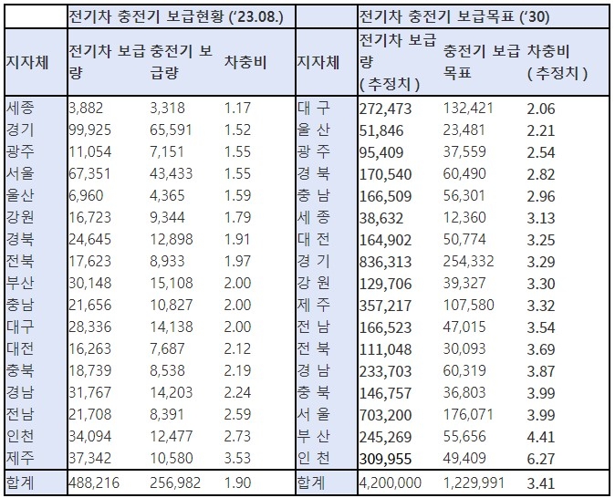 그러나 충전인프라의 지역별 편차는 크게 해소되지 않는 것으로 나타났다. 현재 세종과 제주의 차충비는 3배 차이나는데, 2030년에 이르면 대구와 인천의 차충비가 약 3배 차이나는 것으로 나타났다.