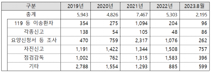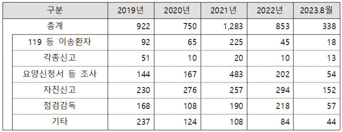 산업재해가 발생했음에도 신고하지 않은 사례는 △2019년 922건 △2020년 750건 △2021년 1283건 △2022년 853건 △2023년 8월까지 338건이다. 고용노동부가 건강보험공단과 연계해 적발이 증가한 2021년을 제외하면 비슷한 추이로 나타나고 있어 숨겨진 사고까지 더할 경우 전체 미보고 건수는 더 늘어날 것으로 보인다.