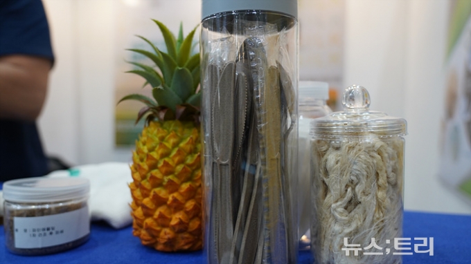 장용호 라이프클린 대표는 "파인애플 잎을 생물학적 가수분해 기술로 섬유 형태로 만들어 면 등과 혼합하면 의류 소재나 생분해성 플라스틱(PLA) 수지 원료로 활용할 수 있다"면서 "탄소도 감축할 수 있고, 폐처리하는 비용도 절감할 수 있어서 농가의 부가수입으로 큰 도움이 된다"고 말했다. 이 회사는 파인애플 주요 생산지인 대만, 중국, 인도네시아 등의 농장과 계약을 맺고 폐기되는 파인애플 잎을 수입해 생분해 원료를 생산하고 있다.