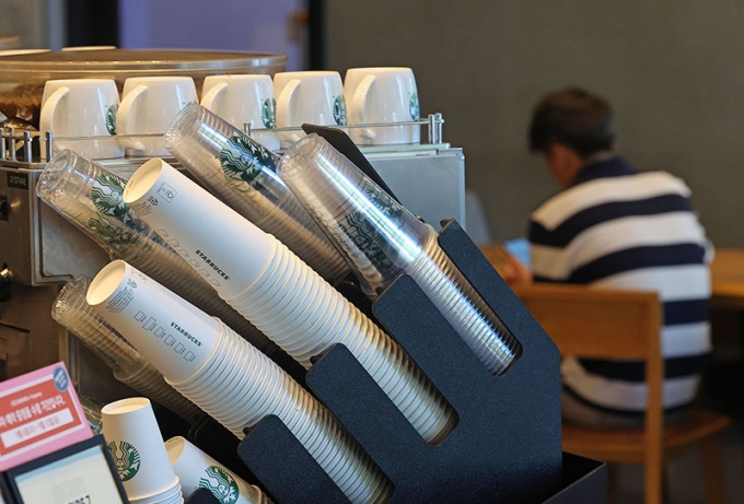 ▲서울의 한 프랜차이즈 카페에 일회용컵이 쌓여있다. (사진=연합뉴스)