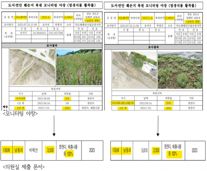 2022년 한려해상 염개갯벌에 2194만원으로 2000㎡ 면적에 심은 갯잔디 활착률은 30%, 칠면초, 갯질경은 75% 활착률을 보였다. 다도해해상 남동리갯벌은 2021년과 2022년에 복원한 갯잔디 활착률이 모니터링 야장에는 각각 50%, 40%라고 써있지만, 의원실 제출 문서에는 활착률 100%로 보고됐다.