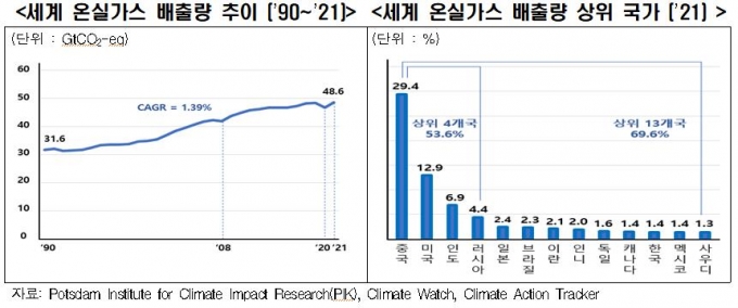 특히 이 4개국의 배출량을 합산하면 세계 배출량의 50%를 넘는다. 따라서 이들의 온실가스 감축여부가 기후대응 성패를 판가름할 수 있다고 한경협은 설명했다.