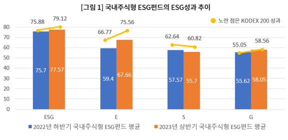ESG 평가 및 투자자문기관 서스틴베스트가 투자종목 구성에 따라 ESG펀드 단위의 ESG성과를 평가해 30일 발간한 '2023년 상반기 펀드 지속가능성 분석 보고서 파트A'에 따르면, 국내 69개 펀드의 ESG점수 평균이 2022년 하반기 75.70점에서 올 상반기 77.57점으로 상승했다.