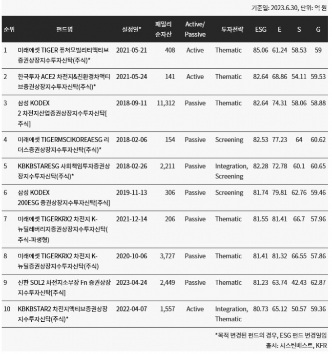 이번 평가에서 1위를 한 펀드는 '미래에셋 타이거(TIGER) 퓨처모빌리티액티브 증권상장지수투자신탁(주식)'가 차지했다. 다른 ESG펀드에 비해 자산규모가 작은 기업에 투자하는 비중이 높음에도 불구하고 전반적으로 ESG 성과가 뛰어난 종목에 투자한 때문이다. 출시된지 3년이 경과한 3개 펀드도 상위 10위에 랭크되기도 했다. 상대적으로 출시된지 오래된 ESG 펀드가 ESG 점수 상위에 위치한다는 것은 이들 펀드가 장기간에 걸쳐 꾸준하게 우수한 ESG성과를 보이는 종목들에 투자를 해왔다는 것을 의미한다.