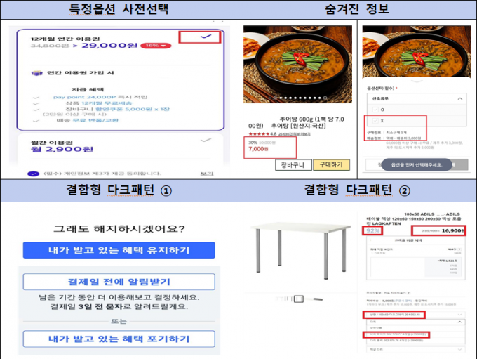 가령 구독료가 높은 상품이 미리 선택돼있거나(특정옵션 사전선택), 제품 구매 시 최소(또는 최대) 구매 수량이 있다는 표시를 하지 않아 구매과정에서 확인되는 경우(숨겨진 정보), 낮은 가격으로 유인했으나 실제로는 해당 제품이 없는 경우(유인 판매), 판매 상품이 아닌 다른 상품의 후기가 포함된 경우(거짓 추천) 등이다.