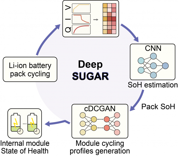 딥슈가는 학습을 통해 새로운 창작물을 만드는 생성형 인공지능 기술 '생성형 대립 신경망'(GAN)과 효과적으로 이미지를 처리할 수 있는 '합성곱 신경망(CNN)'을 결합한 것이다. 리튬 배터리를 충·방전할 때 얻은 전압, 전류, 용량 데이터를 빛의 삼원색 값으로 변환해 이미지화하고, 이를 기반으로 딥러닝 모델을 활용해 배터리의 건강 상태를 예측한다.
