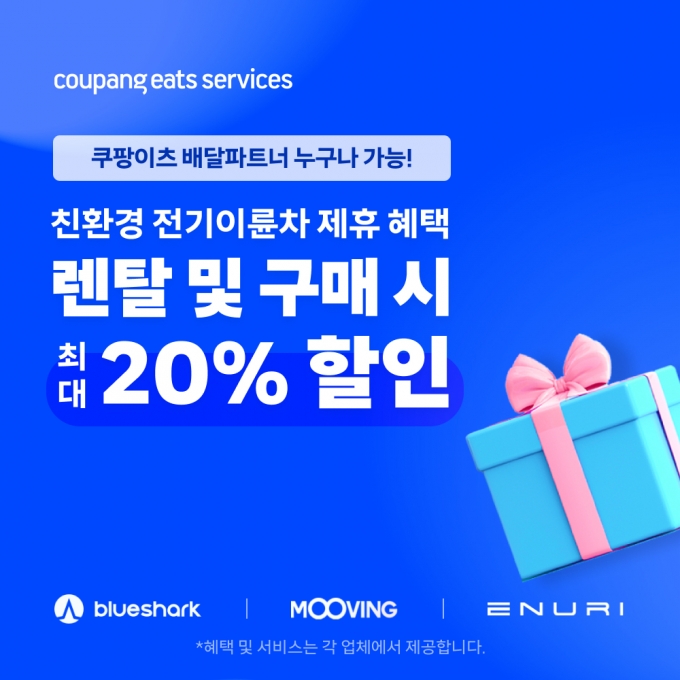 쿠팡이츠서비스는 전기이륜차 전문업체 블루샤크코리아, 무빙, 이누리와 제휴해 배달파트너들이 전기이륜차 구매 또는 렌탈시 제휴업체로부터 할인 혜택을 받을 수 있도록 했다. 다양한 기업 제휴로 여러가지 기종의 구매, 렌탈 상품을 구비해 선택의 폭을 넓혔으며, 등록된 모든 배달파트너는 별도의 조건 없이 제휴 혜택을 받을 수 있도록 해 전기차에 대한 접근성을 높이고자 했다고 기업은 설명했다.