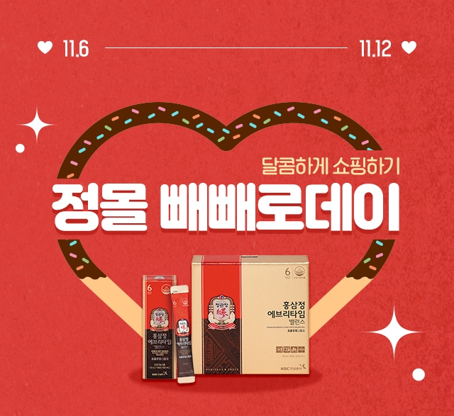 KGC인삼공사가 11월 11일 '빼빼로데이'를 맞아 정관장 직영 온라인몰인 정관장몰에서 오는 11월 12일까지 프로모션을 진행한다.