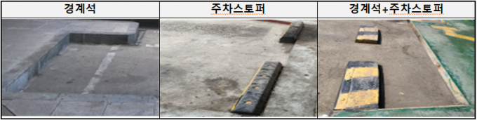 조사대상 35개소 중 24개소(68.6%)는 주차스토퍼와 경계석 중에 하나만 설치했다. 이마저도 10개소는 주차스토퍼 또는 경계석 높이가 최대 12.5cm로 평균치인 14cm보다 낮았다.
