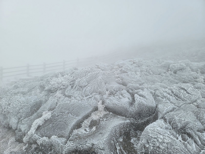 전국이 영하로 기온이 뚝 떨어진 가운데 제주 한라산에 강풍과 함께 첫눈이 쌓였다.