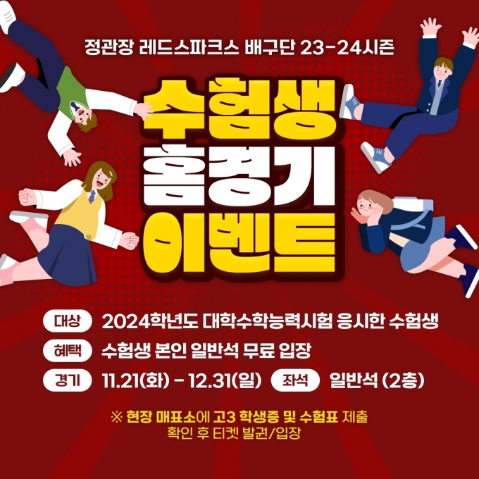 15일 정관장은 수험생을 위해 오는 12월 31일까지 남자 프로농구단 '정관장 레드부스터스'와 여자 프로배구단 '정관장 레드스파크스' 홈경기에 한해 무료관람을 진행한다고 밝혔다.