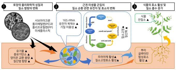 일반적으로 미세플라스틱이 식물세포 손상, 활성산소종(ROS) 생성, 광합성 및 발아 감소, DNA 손상 등으로 식물에 부정적 영향을 주는 것으로 알려져 있으나, 토양-식물 환경에서 주변 근권 미생물의 풍부도와 다양성에 영향을 줘 질소 순환에 변화를 일으킬 수 있음을 시사한다.