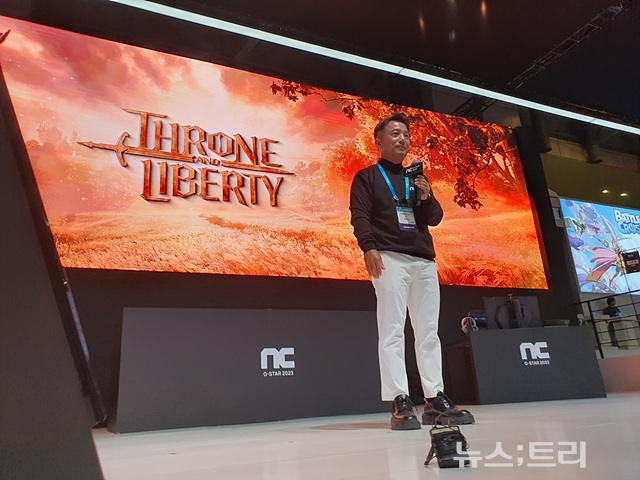 김택진 대표는 16일 부산 벡스코에서 '지스타 2023' 개막 직후 엔씨소프트 전시부스를 방문해 "다중접속역할수행게임(MMORPG)이 아니라 새롭게 도전하는 장르를 가지고 플레이어를 만나려고 왔다"고 밝혔다.