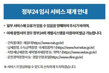 이는 이틀째 행정망이 복구되지 않자 가장 시급한 민원서류만 따로 온라인 발급할 수 있도록 임시 조처한 것으로 보인다. '정부24'의 민원서류 발급 서비스는 여전히 중단돼있다. 오프라인 발급도 불가능한 상태다.