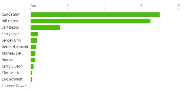 그 다음으로 마이크로소프트 창업자 빌 게이츠, 제프 베이조스 아마존 회장, 구글 공동창업자인 래리 페이지와 세르게이 브린, LVMH 회장 베르나르 아르노, 델 회장인 마이클 델, 러시아 재벌 로만 아브라모비치, 오라클 창업자 겸 회장인 레리 엘리슨, 테슬라 CEO인 일론 머스크, 구글 전 회장인 에릭 슈미트, 스티브 잡스 배우자이자 에머슨 콜렉티브 회장인 로렌 파월 순이다.