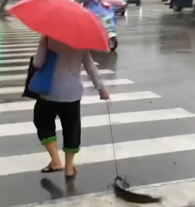 비오는 날 물고기에 목줄을 채워 길거리를 산책하는 황당한 일이 중국에서 포착됐다.