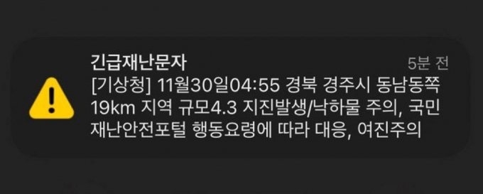 새벽에 느닷없이 요란하게 울린 재난문자 때문에 전국민이 새벽잠을 설쳤다. 경북 경주에서 발생한 규모 4.0 지진에 대한 재난문자가 전국민을 대상으로 발송된 것이다.