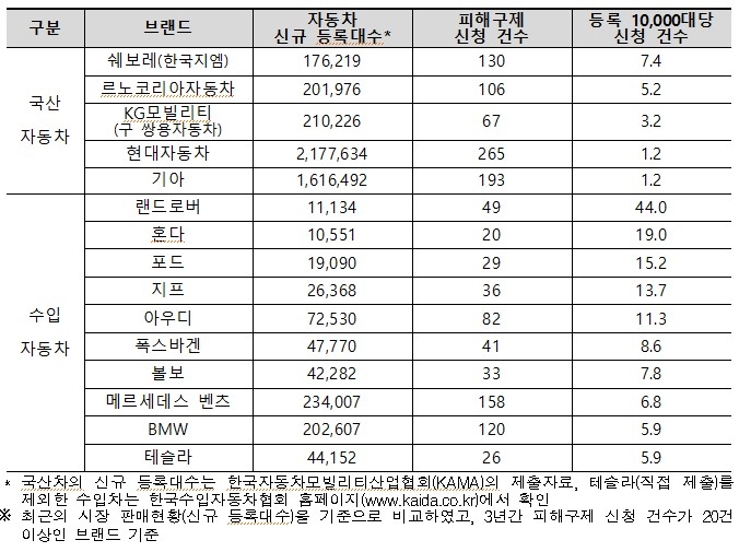 반면 해당기간동안 신규 등록된 자동차 1만대당 피해구제 신청건수는 국산차 중 '쉐보레(한국지엠)'가 7.4건으로 가장 많았고 '르노코리아자동차'가 5.2건, 'KG모빌리티(구 쌍용자동차)' 3.2건, '현대자동차'·'기아'는 각각 1.2건이었다. 수입차 중에서는 '랜드로버'가 44건으로 가장 많았고, '혼다'가 19건, '포드' 15.2건, '지프' 13.7건, '아우디가 11.3건으로 그 뒤를 이었다.