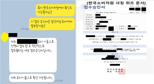 심지어 소비자원의 문서인 것처럼 조작한 '접수승인서'를 보낸 사례도 확인됐다. 위조문서에는 "환불 내용", "처리" 등의 제목을 단 허위 내용이 기재돼있었다.