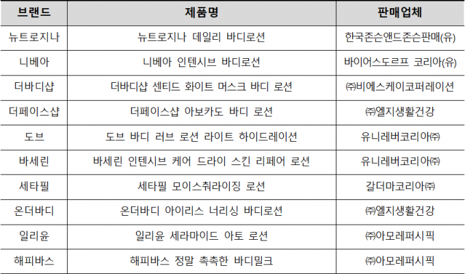 한국소비자원은 소비자가 선호하는 바디로션 10개 브랜드를 대상으로 사용 전후 수분함유량 변화값을 기준으로 보습력을 평가한 결과, 아모레퍼시픽의 '일리윤 세라마이드 아토 로션'과 '해피바스 정말 촉촉한 바디밀크' 2개 제품이 상대적으로 매우 우수한 것으로 나타났다고 20일 밝혔다.