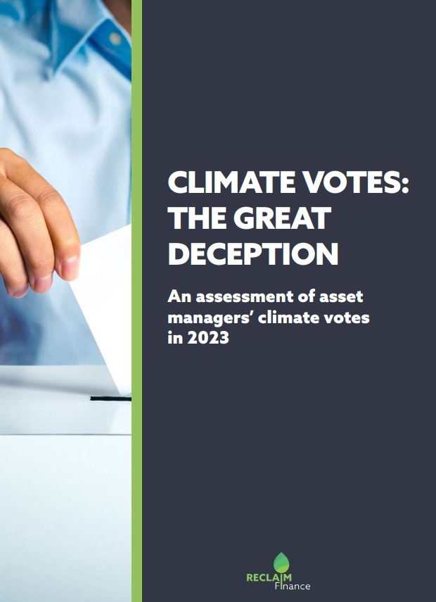 기후금융 비정부기구 리클레임 파이낸스(Reclaim Finance)가 최근 발표한 보고서에 따르면, 조사대상인 30개 자산운용사들은 자신들이 보유한 75개 화석연료 기업의 주주총회에서 화석연료 확대계획을 적극 지지한 것으로 나타났다. 해당 자산운용사들은 기후행동 100+ 투자자 연합에 가입하는 등 그동안 "기후문제에 적극 대응하겠다"고 밝혀왔던 터라, 이번 결과를 두고 '전형적인 그린워싱'이라는 비판이 일고 있다.