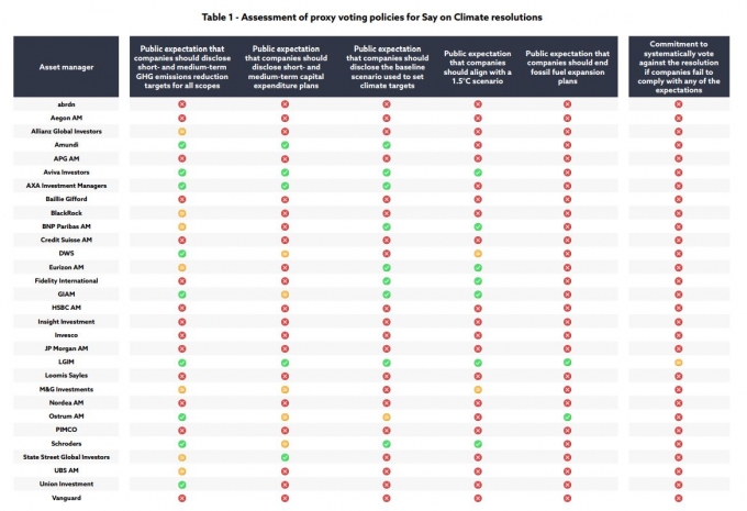 리클레임 파이낸스는 "아문디(Amundi), BNP파리바 자산운용(BNP Paribas Asset Management), UBS자산운용( UBS Asset Management) 등 몇몇 자산운용사는 기후관련 안건에 대한 투표에 일관성 없는 접근방식을 보이기도 했다"고 지적했다.