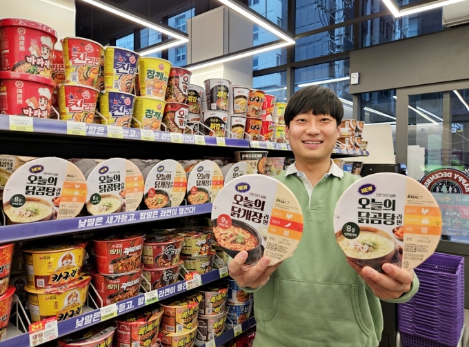 CU는 CJ제일제당과 손잡고 생분해성 바이오 소재인 PHA 코팅기술을 적용한 컵라면 2종 'New 오늘의 닭곰탕'과 'New 오늘의 닭개장'을 출시했다고 2일 밝혔다. PHA는 미생물이 식물성분을 먹고 세포 안에 생성하는 고분자 물질이다.