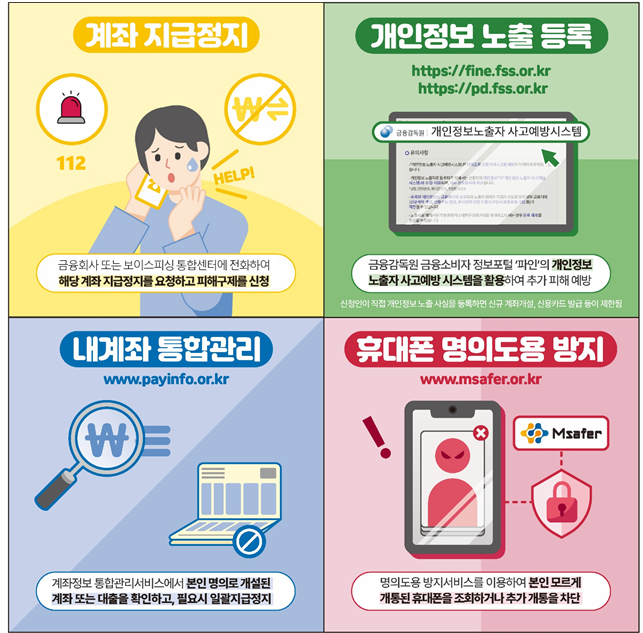 금감원은 "개인정보 제공과 자금이체 요청은 무조건 거절해야 한다"며 "악성코드가 설치된 경우 휴대폰에 저장된 정보가 탈취될 수 있어 계좌번호, 비밀번호, 신분증 사진을 휴대폰에 저장하지 말라"고 당부했다.