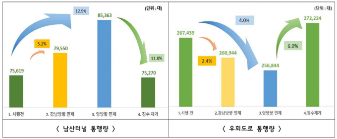 실험 결과, 1단계에서는 남산터널 이용 교통량이 약 5.2% 늘어났으나, 터널과 직접 연결된 도로에서는 5∼8% 수준의 속도 감소가 나타난 것을 제외하면 터널 주변지역 도로들에서 전반적으로 큰 혼잡이 나타나지 않았다. 반면 이후 2단계에서는 남산터널 이용 교통량이 12.9% 늘어났고 소공로와 삼일대로, 을지로 등 도심 주요 도로들의 통행속도가 최대 13%까지 현저하게 떨어졌다.