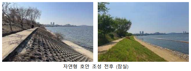 서울시는 2025년까지 콘크리트로 조성된 호안을 흙과 자갈, 바위 등 자연소재로 복원하는 '자연형 호안 조성 사업'을 2025년까지 완료할 계획이라고 8일 밝혔다. 한강변의 호안 길이는 총 82㎞에 이른다. 이 가운데 교량, 접안시설 등 안전상의 이유로 복원할 수 없는 지역을 제외한 57.1㎞를 모두 복원한다. 지난 2023년에는 46.9㎞까지 복원을 완료했다.