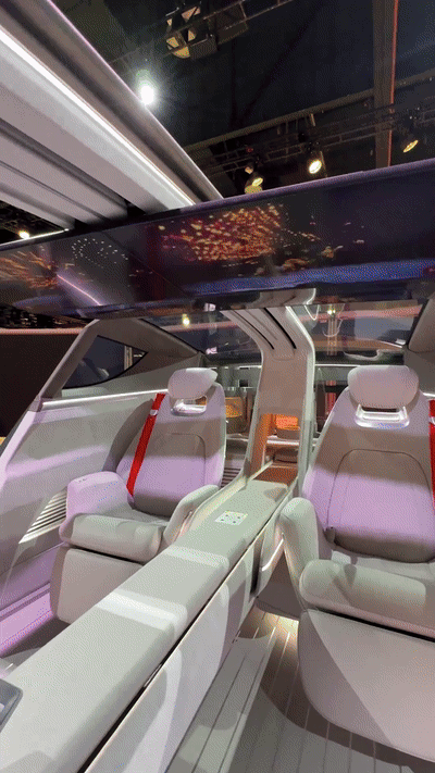 알파블 내부를 살펴보면 운전대가 있어야 할 자리에 45인치 올레드 디스플레이가 펼쳐져 있다. 시야를 꽉 채우는 디스플레이와 사운드로 차량 내부가 순식간에 영화관으로 변신하고 만약 게임을 하고 싶다면 동승자와 마주 보고 게임을 할 수 있도록 의자가 돌아가고 천장에 설치된 27인치 스크린 2개가 V자 형태로 내려와 오락실이 펼쳐진다. 심지어 자동차 장착된 ZKW의 매트릭스 헤드라이트를 벽면에 비추면 나만의 자동차 극장을 만들 수도 있다.