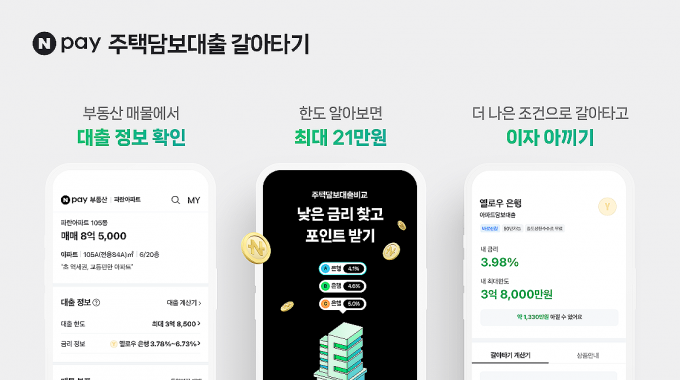 주담대 갈아타기와 함께 출시된 네이버페이의 '주택담보대출 새로받기' 서비스도 같은 기간 4만6000건이 넘는 비교 조회수를 기록했다. 이 중 약 5600건이 각 금융사의 신청 과정을 진행하는 등 대환대출 뿐만 아니라 신규대출 비교도 주목받고 있다. 주담대 새로받기는 업계에서 유일하게 모든 제휴 금융회사의 신규대출을 한 번에 조회할 수 있고, 네이버페이 부동산 내 '우리집' 서비스와의 연동으로 더욱 간편하게 여러 대출을 비교해 볼 수 있다.
